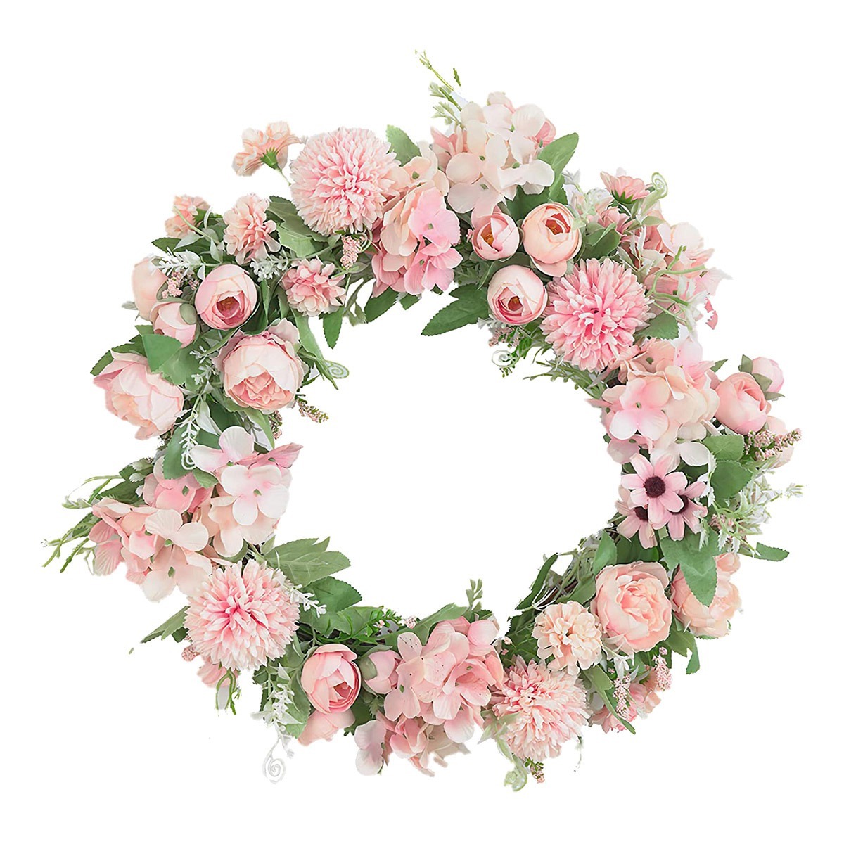 Элегантный декоративный венок, выполненный в нежных розовых и пастельных оттенках, станет изысканным украшением для любого торжественного события. Композиция состоит из пышных искусственных цветов — роз, георгинов, гортензий и декоративной зелени, создающих гармоничное и воздушное сочетание.